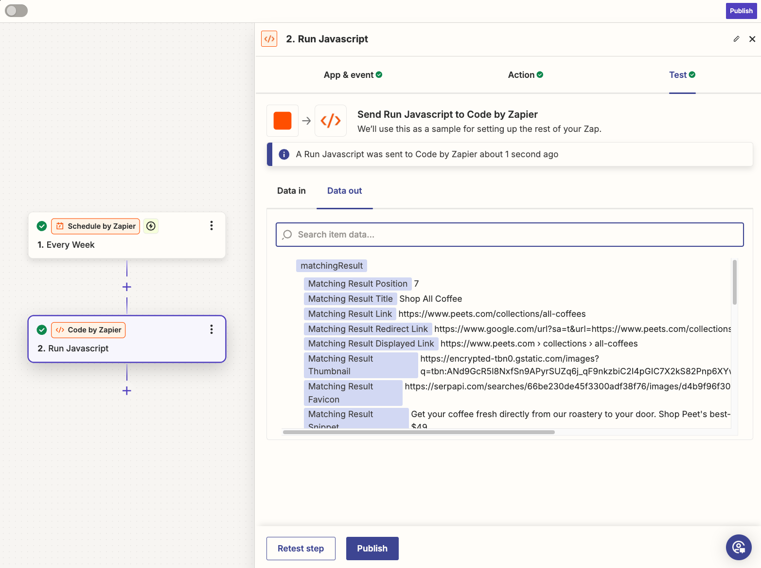 In this article, we will build a Zap that triggers weekly to fetch organic results from SerpApi’s Google Search API. We will then parse the results of our query to find a website's ranking (how far down the list of organic results it is).