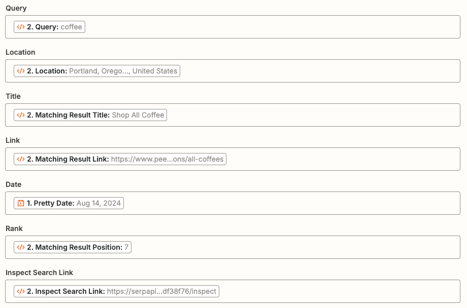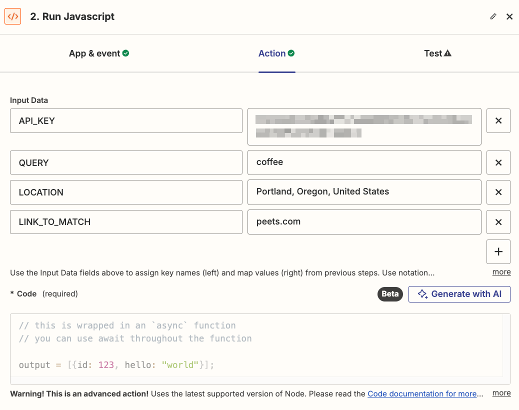 Typically, you will want to search for multiple keywords to track SEO changes, but due to limitations in Zapier, we were only able to perform a single API call to SerpApi in this demo. Zapier requires that all code actions resolve within a specific time limit or RAM usage; see Code rate limits.