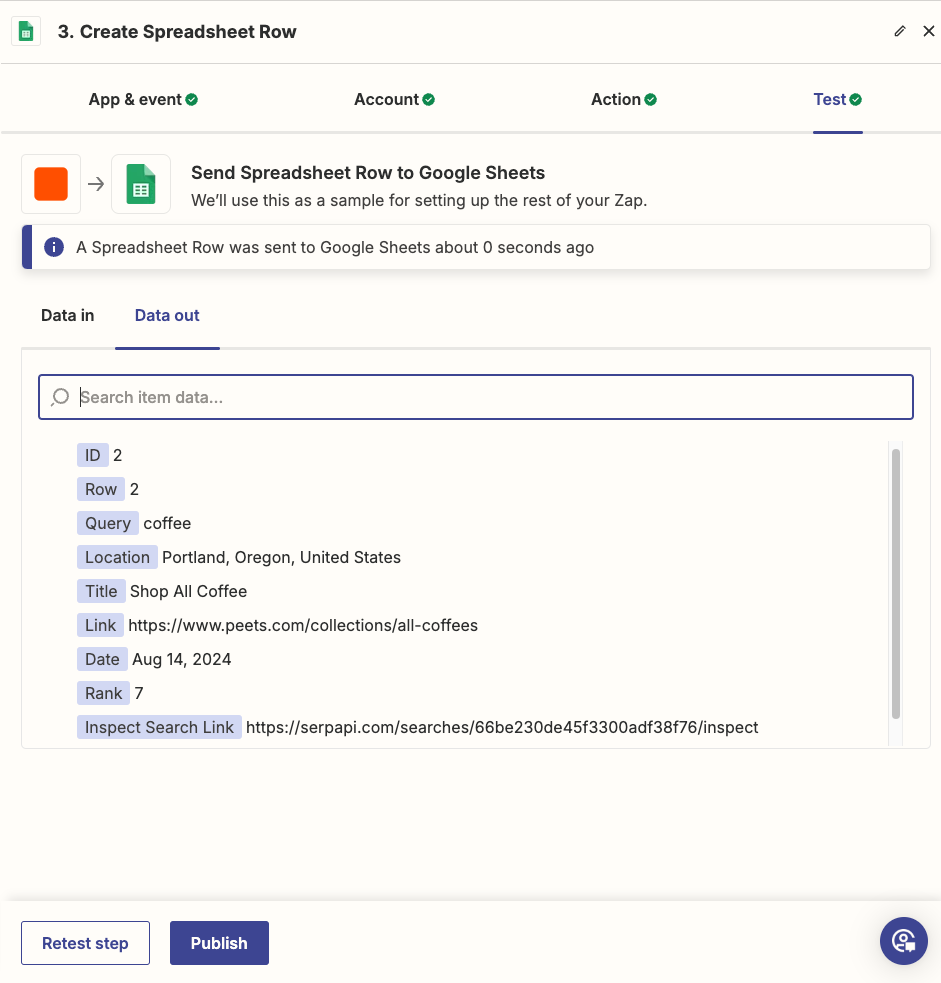 Click Test Step, and Zapier will run the action. Once complete, if your test was successful, you should be presented with the Data Out tab with information about the row created.