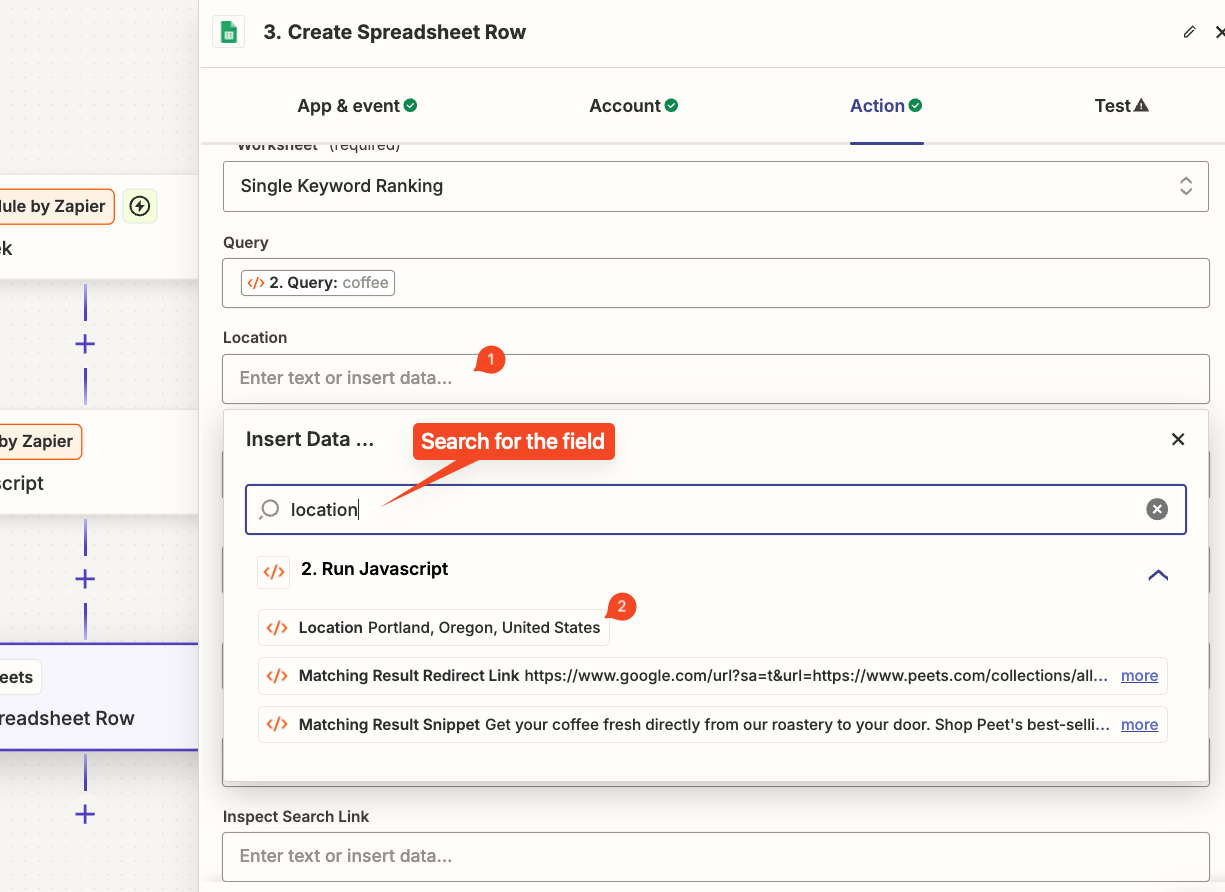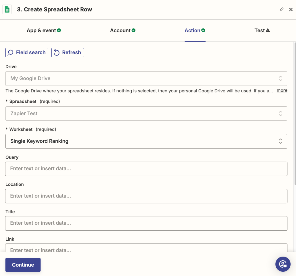 After selecting the worksheet, Zapier should automatically populate additional fields from the headers (first row of your spreadsheet). We can now map the data from SerpApi to our Google Sheet.