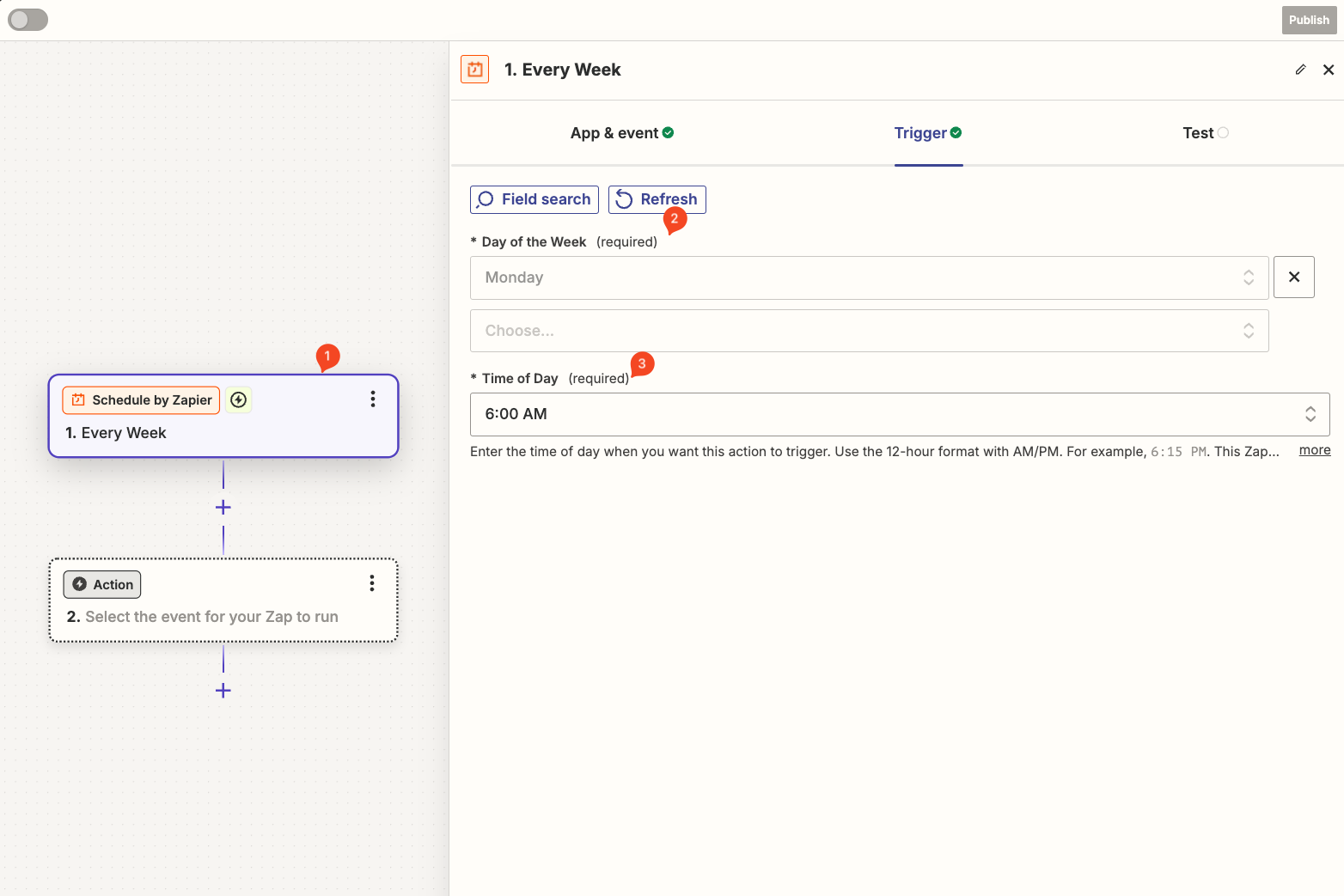 From the App & Event tab of the Schedule trigger, set a frequency for the Zap to run. I've selected a weekly event that triggers Mondays at 6:00 a.m., but feel free to configure these settings to your use case.