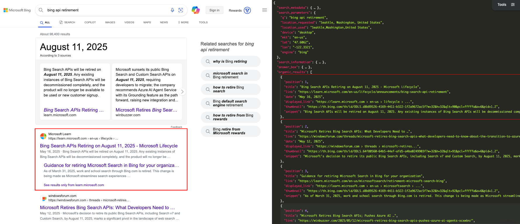 Here at SerpApi, we provide our own Bing Search API that can be easily integrated to minimize disruption to your service once the official APIs have been retired.