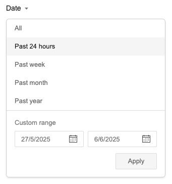 freshness- Controls the age or date-range of search results. These can be achieved using thefilterparameter in our API with the following values:- Value