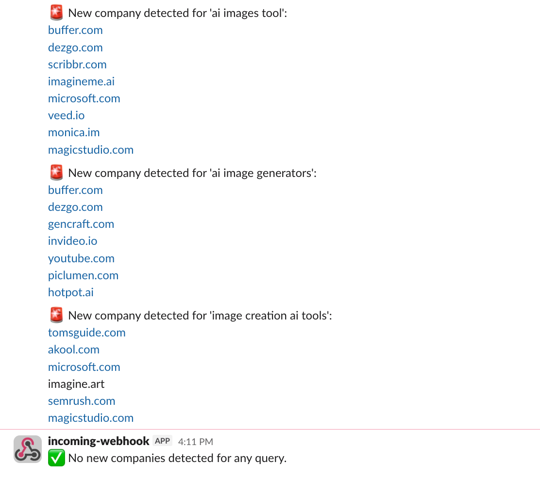 Monitoring when competitors begin ranking for new keywords can reveal product launches and marketing strategy changes. Instead of manually checking search results every day, you can automate the process with a Slack bot that sends alerts whenever a new company appears for keywords that matter for your brand.