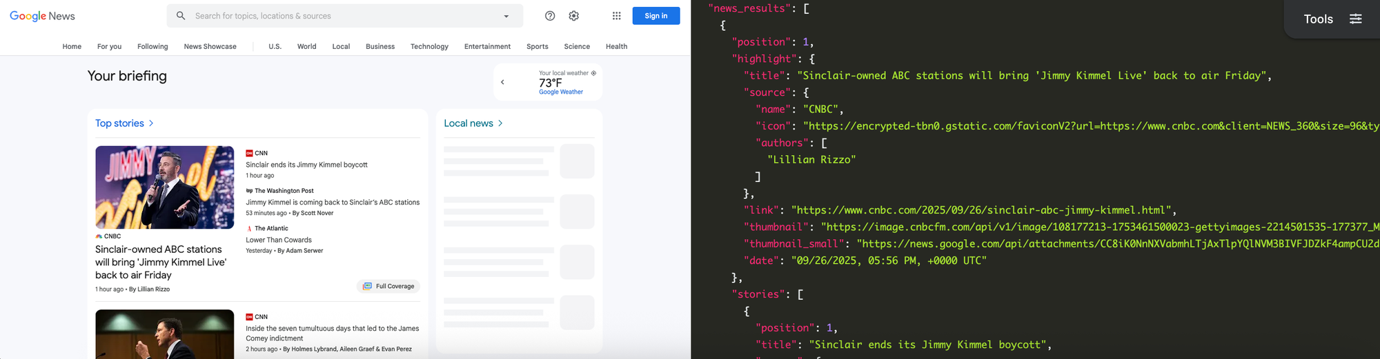 "date": "09/30/2025, 09:25 PM, +0000 UTC"Each result has a completely different article with different sources. The topic, language, and all other parameters stayed the exact same other than the gl parameter. In order to track these major differences, changes, and updates and collect all the data consistently and efficiently, you will need an automation tool. This example shows how quickly and easily we can collect accurate data from Google News.