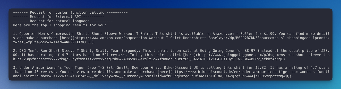 Now our shopping assistant talks just like a human. It also informs us of additional information that they got from the JSON results.