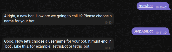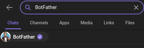All Telegram bots are descendants, so to speak, of the BotFather. We'll start a chat with @BotFather to ask him for a token.