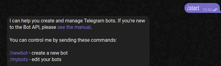 Kick things off by sending /start as a message to the BotFather.