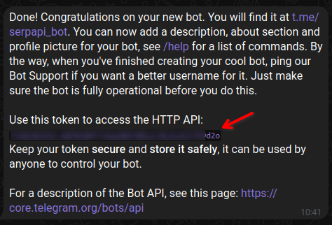 Finally, you'll get this message confirming creation of your token. Keep this secret or anyone can hijack your bot.