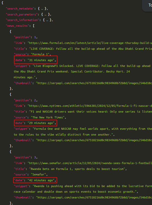We can check our results in the Playground to ensure we're getting what we want. Looking at the JSON response, we get a news_results object indicating our news filter is working and checking the date field shows each result being published less than an hour ago.