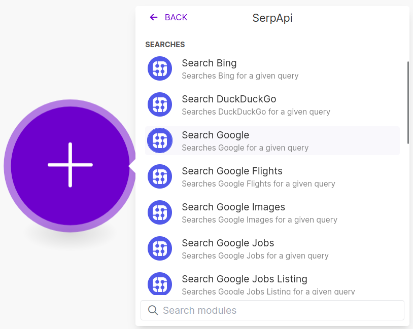 Search for SerpApi and select the Search Google Module.