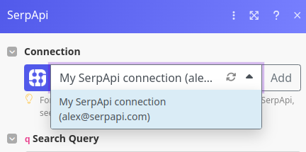 Make will do a test call to the SerpApi Account API to confirm your API key is valid. Assuming it's valid, you'll see your SerpApi account email appear next to your newly created connection.