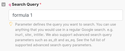 Now we can configure the search query. We'll search for formula 1.