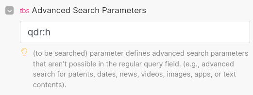 To filter only for the last hour, find the tbs parameter and set it to qdr:h as we did in our API Playground query.