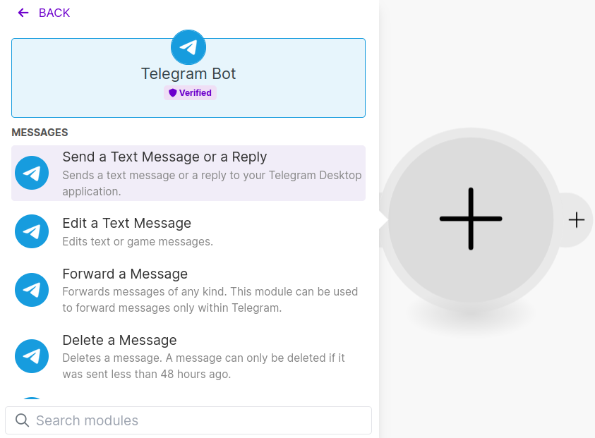 The last Module we need to add is Telegram's Send a Text Message or a Reply Module.