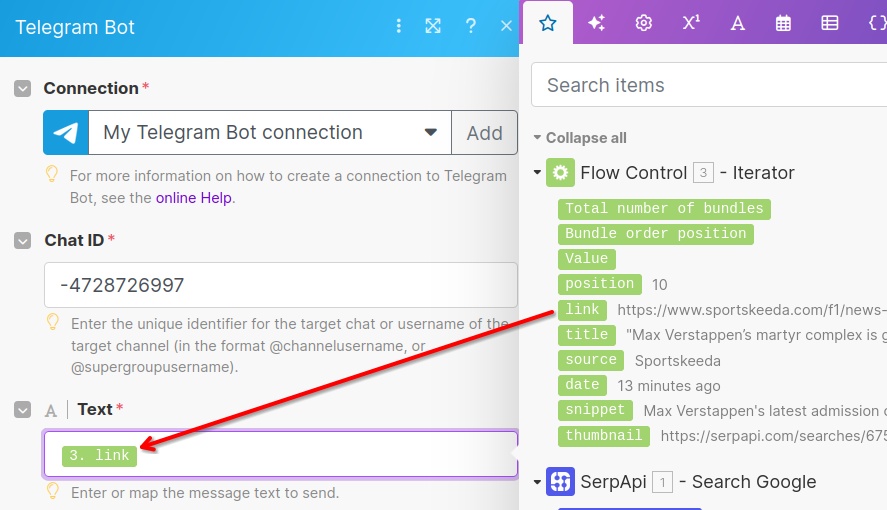 For the Text field, select the link field from the green Iterator output; not the blue SerpApi output. Feel free to include any other free form text or fields in your message. This will be the content we send to Telegram.