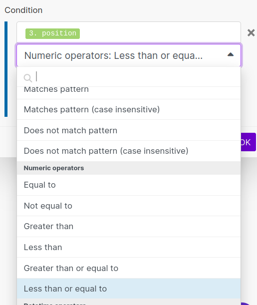Build a filter condition for the position field of the Iterator Module. The condition should be a numeric operator for "Less than or equal to."