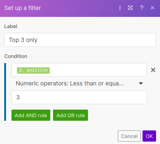 We want only the top 3 so we'll set the filter to allow news results when the position is less than or equal to 3.
