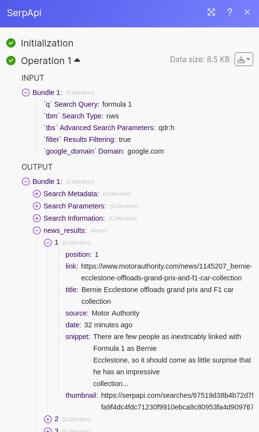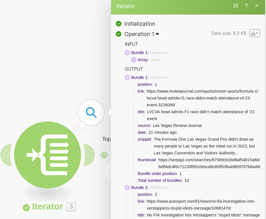 Check the SerpApi Module's output. You should see a single Bundle with a news_results array containing 10 news articles.