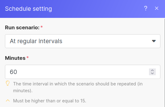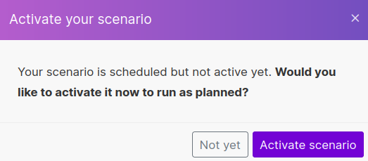 Once you save those settings, Make will prompt you to activate the Scenario so it will start following the schedule. Hit "Activate scenario" if you're ready.