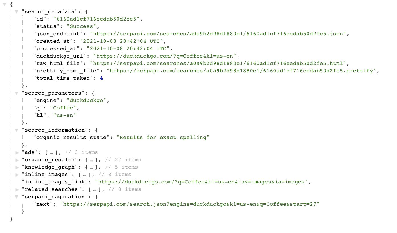 One thing that jumps out to me is the amount of organic_results that are provided in a default search. There are 27 items provided in DuckDuckGo’s search for coffee.