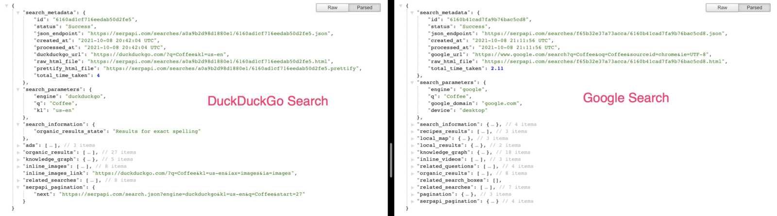 Here’s a quick snapshot of differences of datasets for “coffee” between the DuckDuckGo Search and Google Search API: