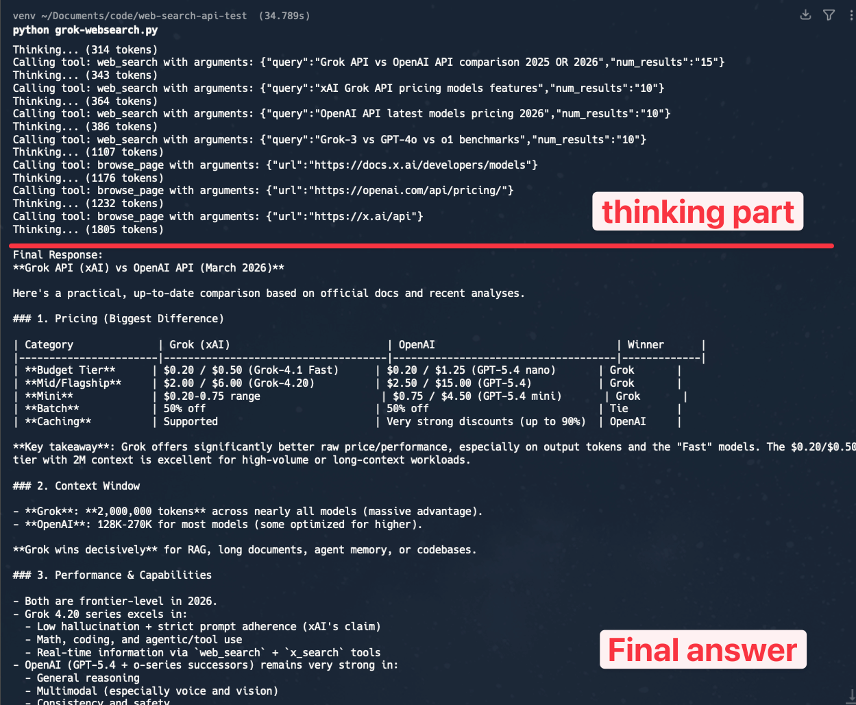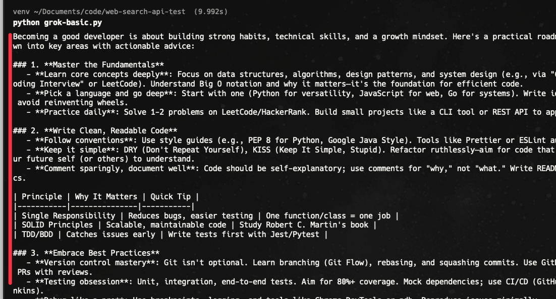 pip install xai-sdk- Set env var: export XAI_API_KEY="your_key_here" or use .env file