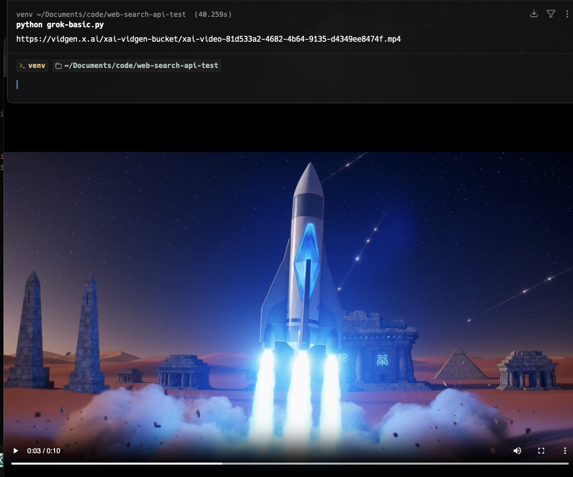 Generating a video is as easy as generating an image with Grok API. We'll need to use the "grok-imagine-video" model for this.