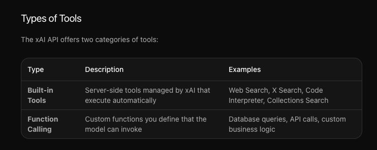 The xAI Grok API features powerful tool calling capabilities, allowing Grok to go far beyond simple text generation. It can take real actions such as performing web searches, running code, retrieving information from your own data sources, or invoking any custom functions you've defined.