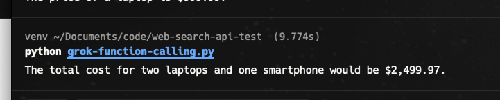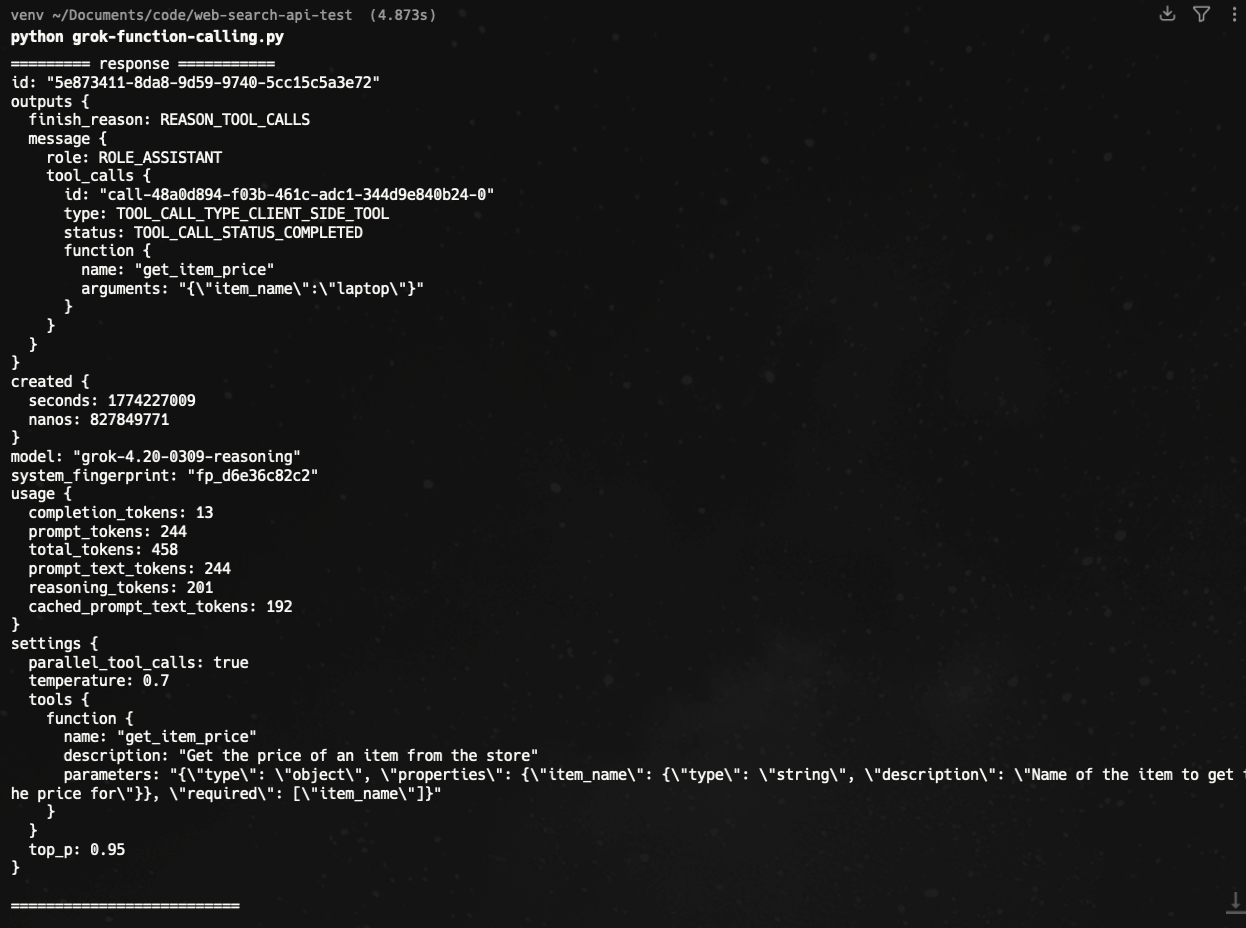 As you can see, Grok can detect the tool we need to call. You can see it from outputs > message > tool_calls . It consists of the name of the function and the arguments that are extracted from the user's prompt, so it'll be dynamic.