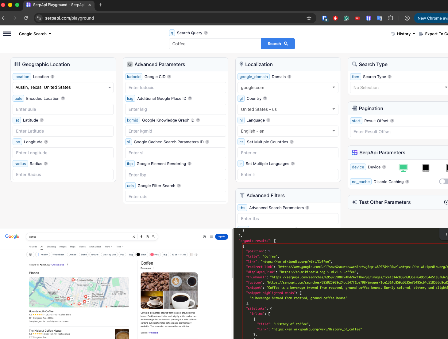 To get some idea of how SerpApi works, feel free to test the results on our playground. You can play with different parameters and directly see the JSON sample we return.