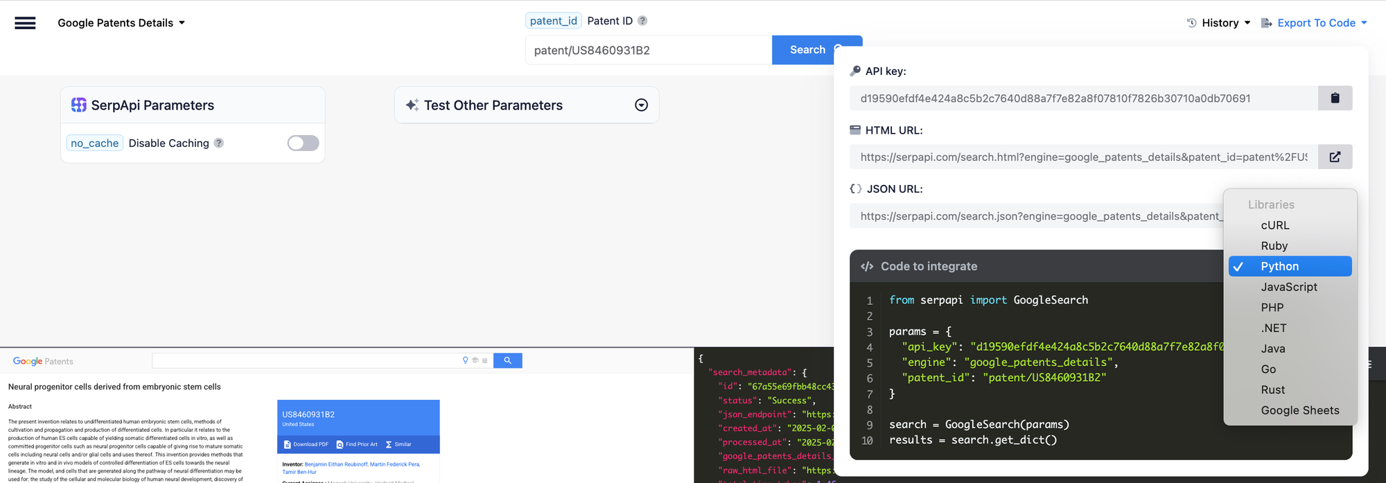To scrape this data, we will use SerpApi's Google Patents Details API. To visualize the data returned by our API, you can head to our playground and run the query using the patent_id:
