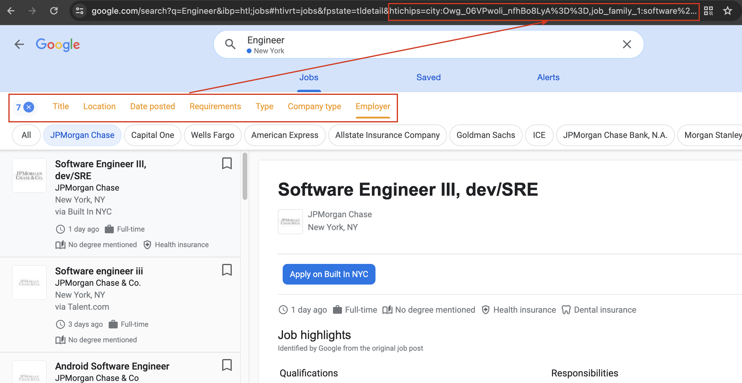 Another practical approach to identifying available filter values involves interacting with the Google Jobs search engine itself. When you apply filters through the Google Jobs interface, the selected options are reflected in the URL's htichips parameter. This URL-encoded string contains the applied filters and their values.