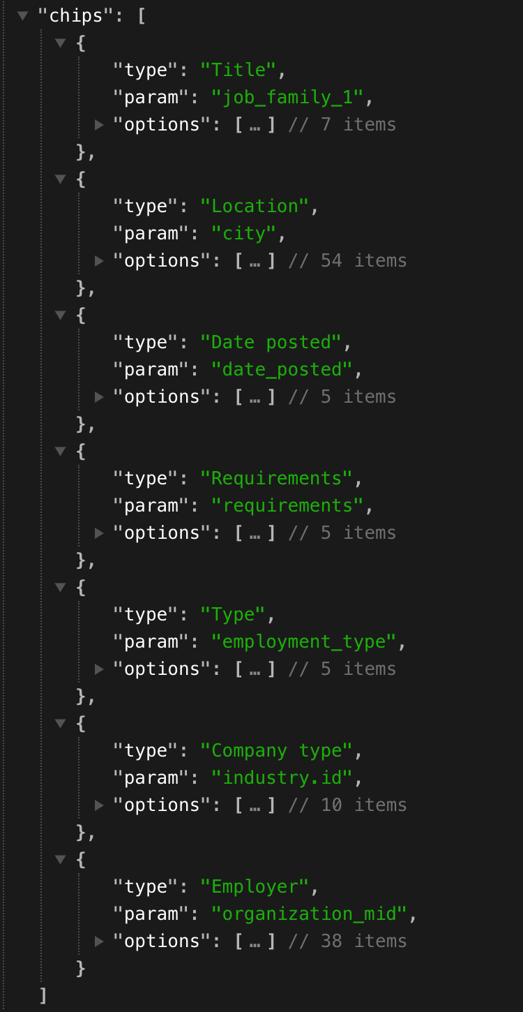 There are two ways to find the available values that the different filters can be used with. One option is the chips array returned in the response from the Google Jobs API. The other one is performing a search in the actual Google Jobs engine and extracting the values from the URL. Let's explore both of these options.