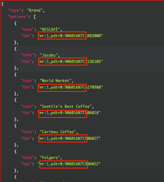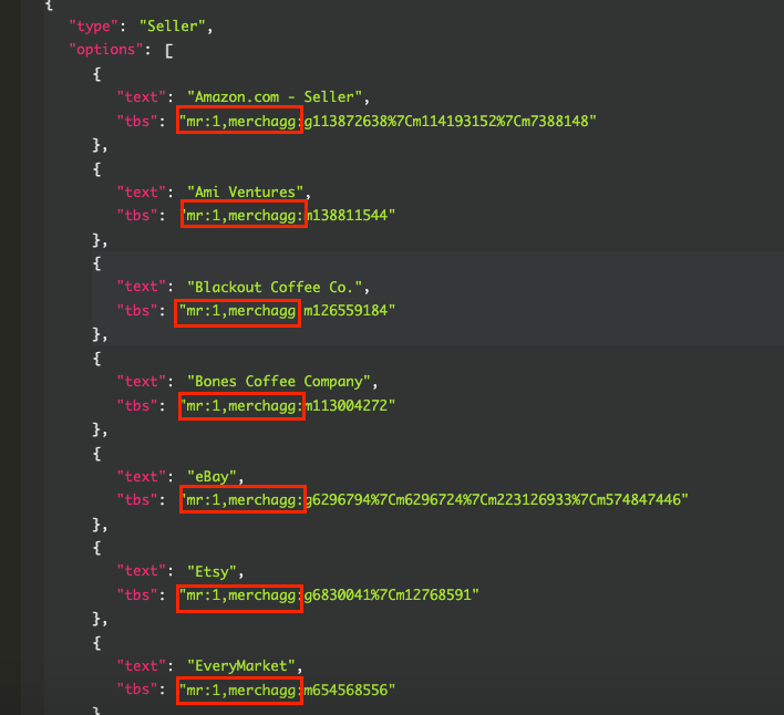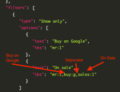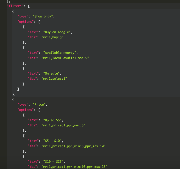 tbs value for specific filtersWhile the method is up to you, we strongly recommend the first one, as it's more efficient if you are looking for all the filters for a given query. With the second method, you must perform multiple searches to extract all available filters. With the first method, you only need to make one API call with our Google Shopping API.