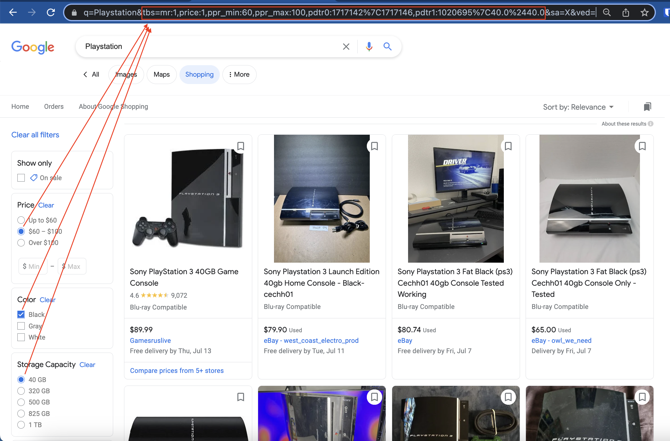 The second way is to run your query directly through Google Shopping, apply appropriate filters, and check the URL for the tbs value. An example can be seen below: