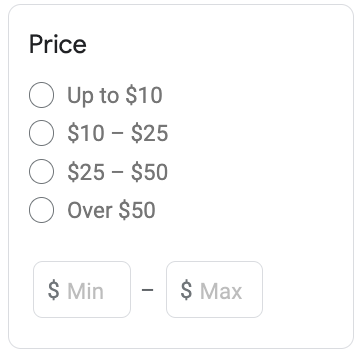 The Price filter can be used to specify the price ranges for your search or to set the minimum or maximum price. The price ranges are always constructed with the tbs=mr:1,price:1,ppr_min:X,ppr_max:Y parameter, where the X value is the minimum price, and the Y value is the maximum price. If you want to set only minimum or maximum value, you can just drop the ppr_max:Y or ppr_min:X parts from the tbs parameter.