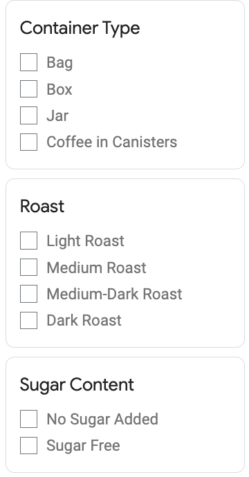 As mentioned above, some filters are only available for specific keywords. For example, for the q=Coffee, you can find Flavor, Container Type or Roast among filters. While those are available for the Coffee search, they will be different for queries like Playstation or Football.