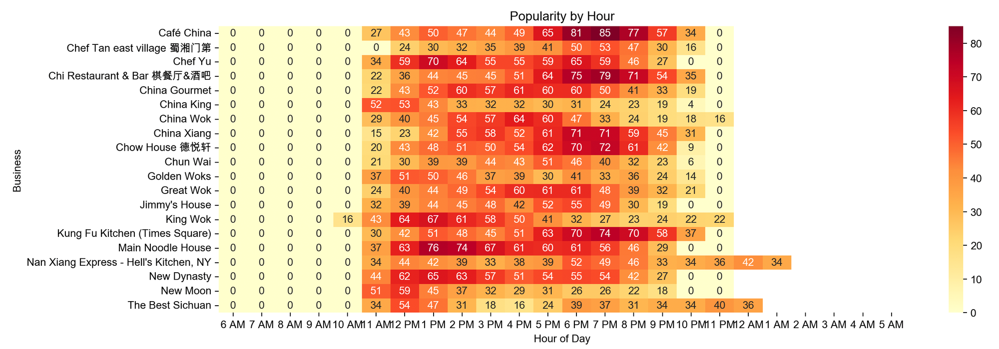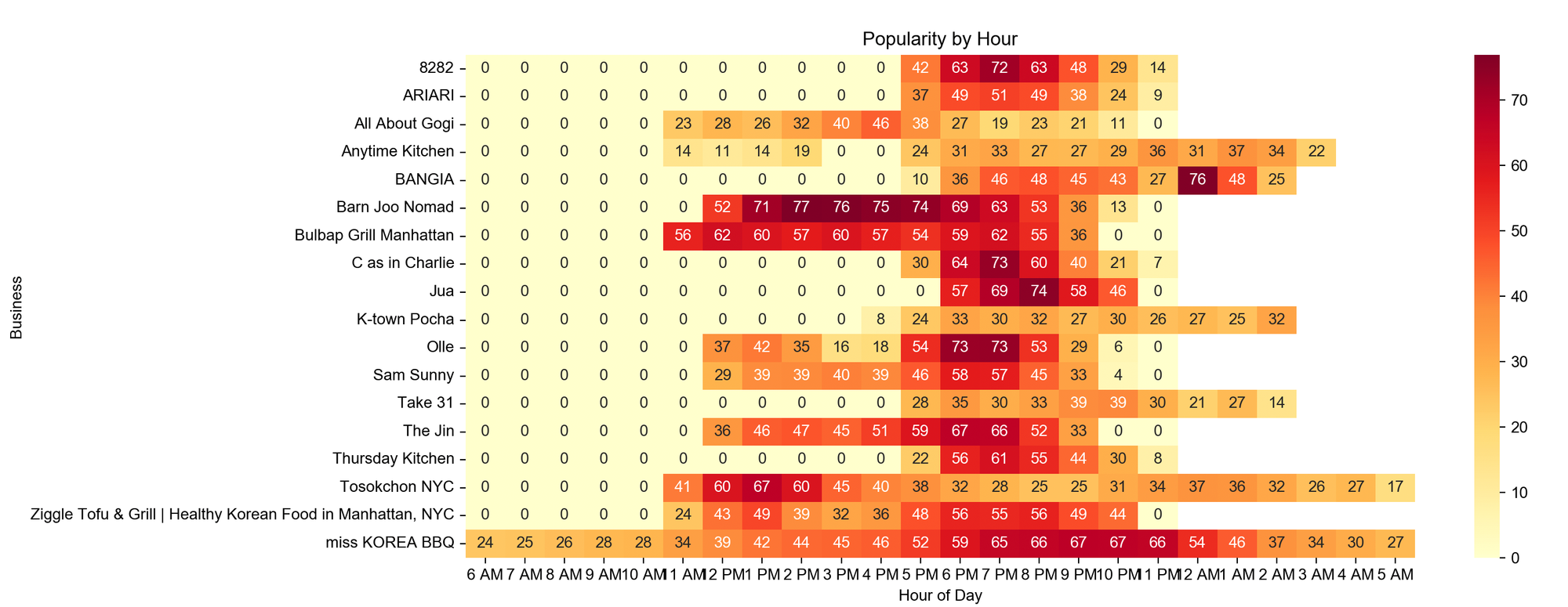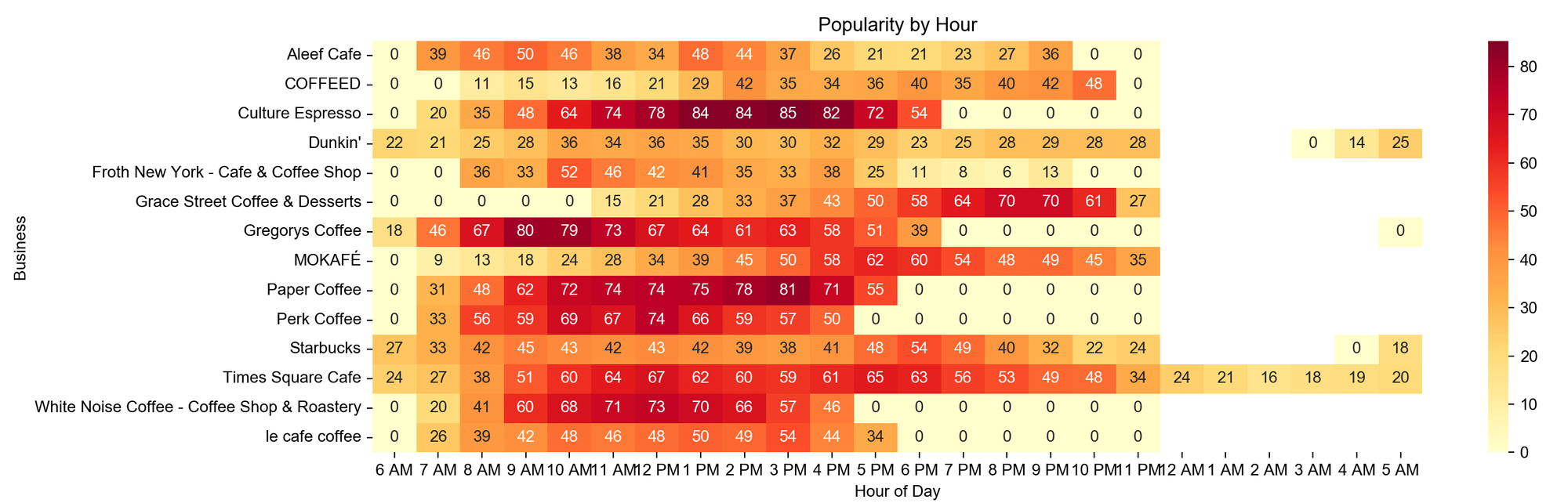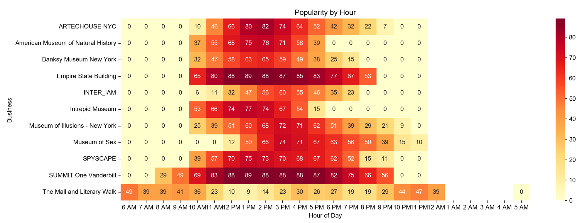 We will use this data to create a graph that better visualizes the popularity of businesses. A heatmap graph is excellent for this as it provides a clear visual representation of the varying levels of popularity across different businesses. By using a heatmap, we can easily identify trends, peak times, and the most popular businesses at a glance.