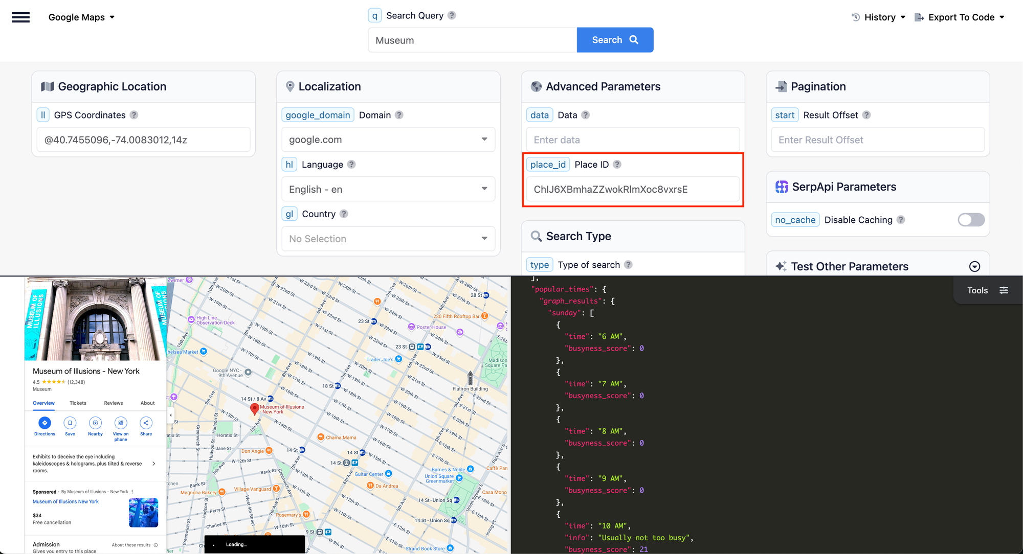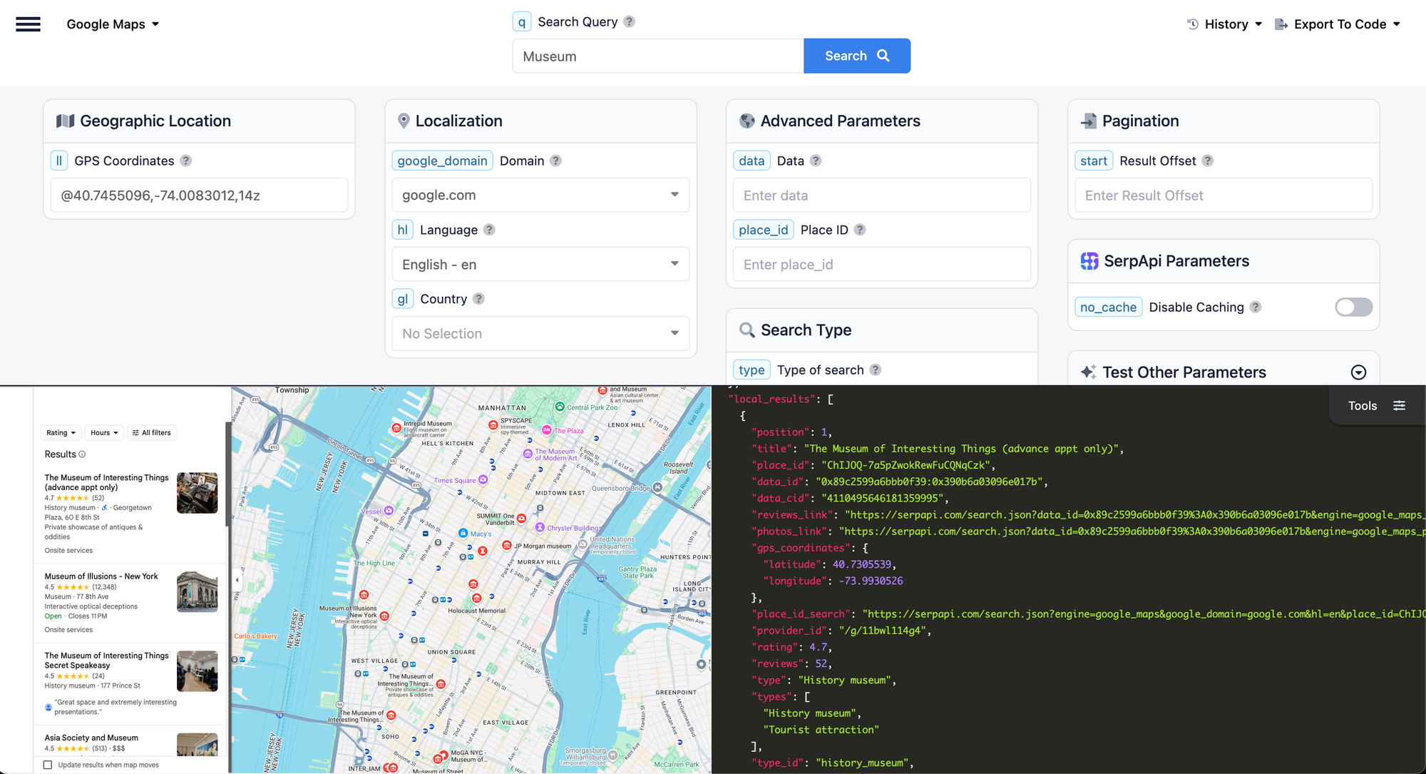 First of all, we use Google Maps Scraper API to search for a list of businesses (e.g. Museum, restaurant, coffee). Below is an example in Playground. We perform a search for Museum in New York using the q and ll parameter respectively.