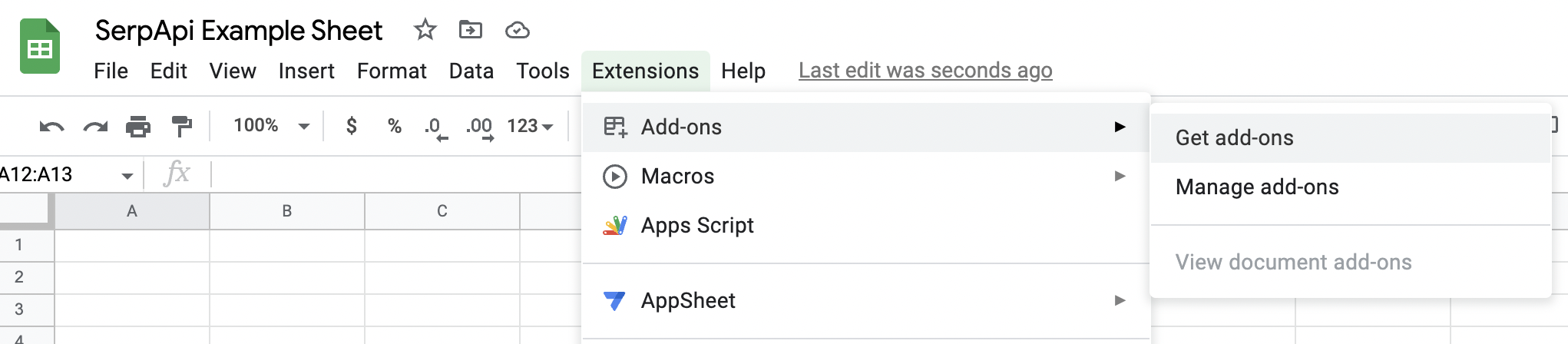 The second thing you need is to get your extension installed in Google Sheets. The process is straightforward. Head to the Google Sheets Extensions -> Add-ons -> Get add-ons and search for SerpApi - Search Engine Results and Ranks.