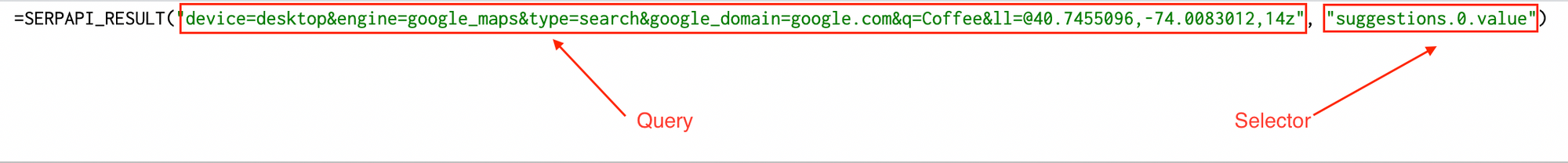 =SERPAPI_RESULT("q=Coffee&engine=google_maps&start=0&ll=@40.7455096,-74.0083012,14z", "suggestions.0.value")Default formula generated from the Playground