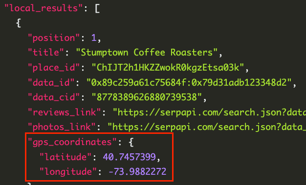 local_results.0.titleSimilarly, for the rest of the result's titles, you will change 0 to 1, 2, and so on. There are some nested responses like the gps_coordinates: