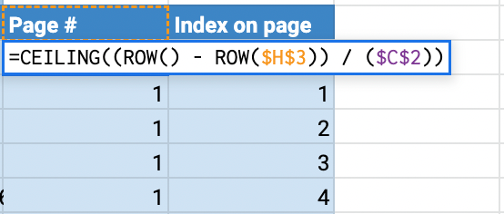 Lastly, we need to focus on getting the proper indexes for the query and page numbers for each row. Since we will not do it manually, we can define page numbers using the built-in Google Sheets CEILING and ROW functions. You can use formulas similar to the ones below and save them as additional columns: