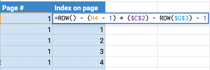 =ROW() - (H4 - 1) * ($C$2) - ROW($G$3) - 1