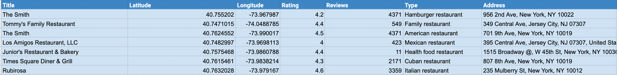 We will focus on extracting restaurant information in New York. You can find the complete Google Sheets example here for future reference.