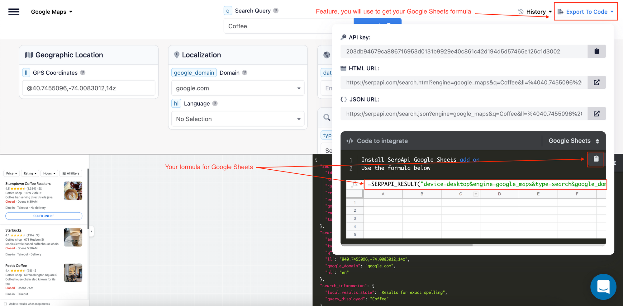 local_results.0.gps_coordinates.longitudeYou should now know how to operate with Google Sheets formulas using the SerpApi extension. Let's try to automate the process to extract more results from your query.