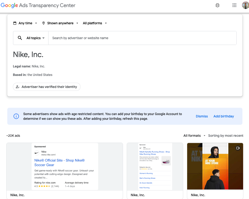 The Google Ads Transparency Center is a feature launched by Google to provide more transparency and information about advertising on its platforms. What's interesting about this page is that we can see ads from any advertiser.