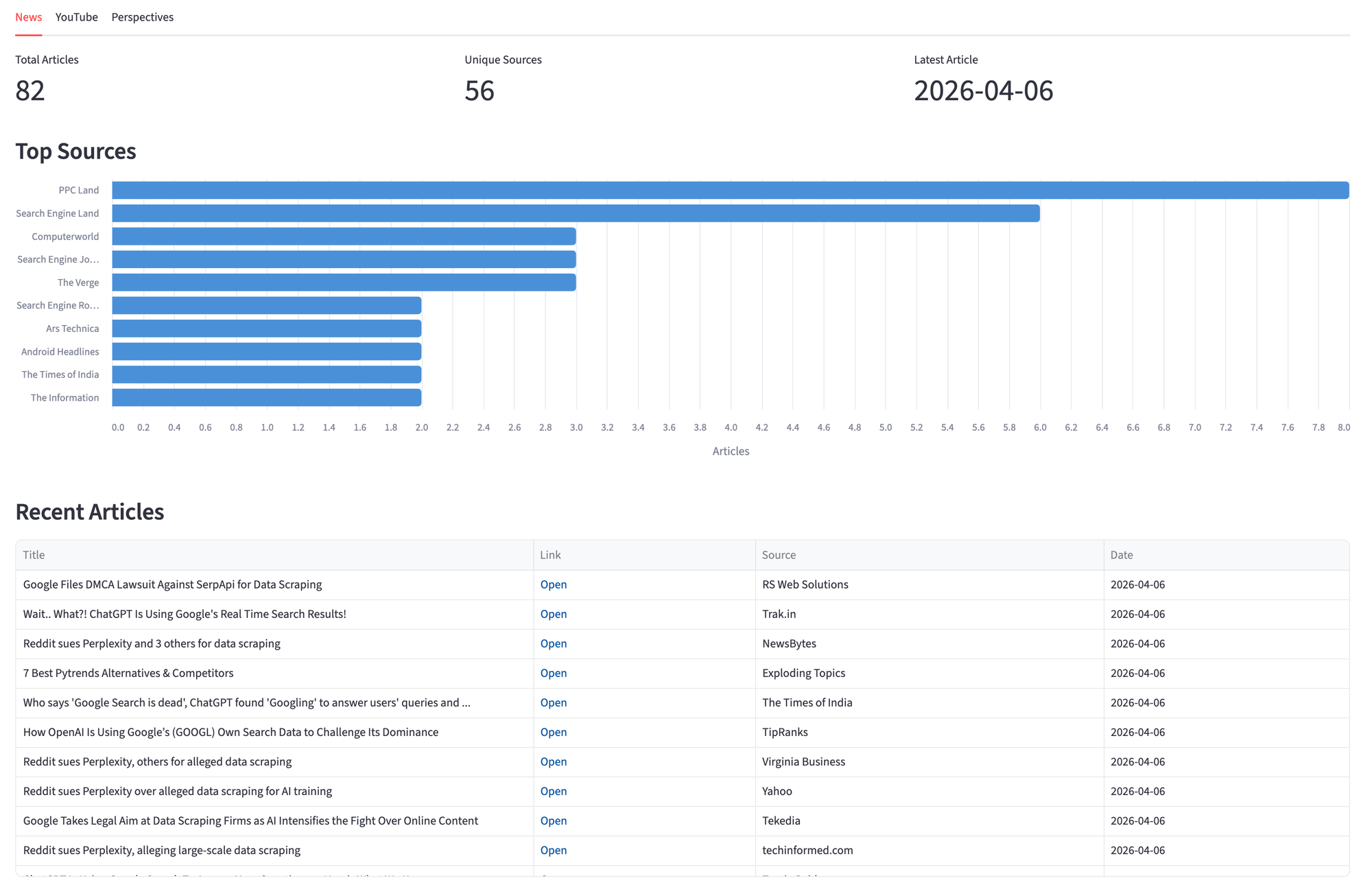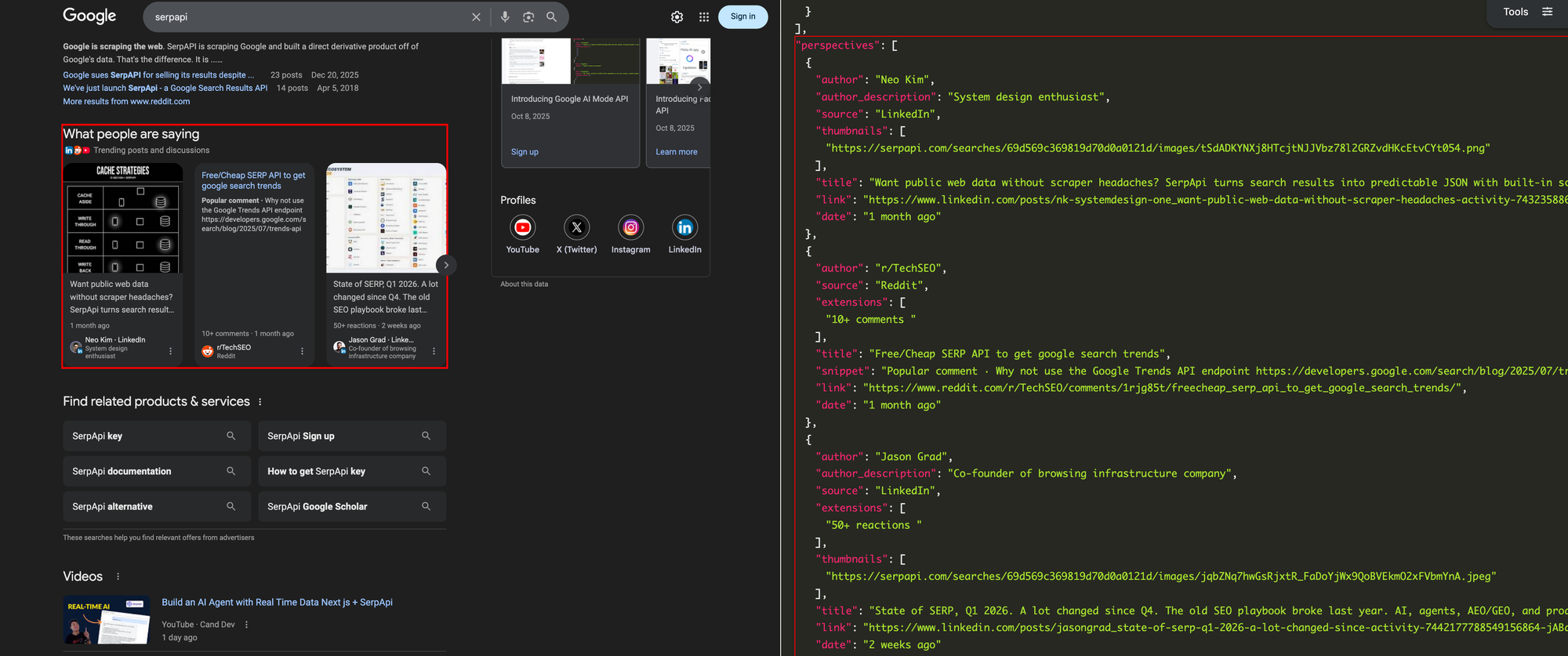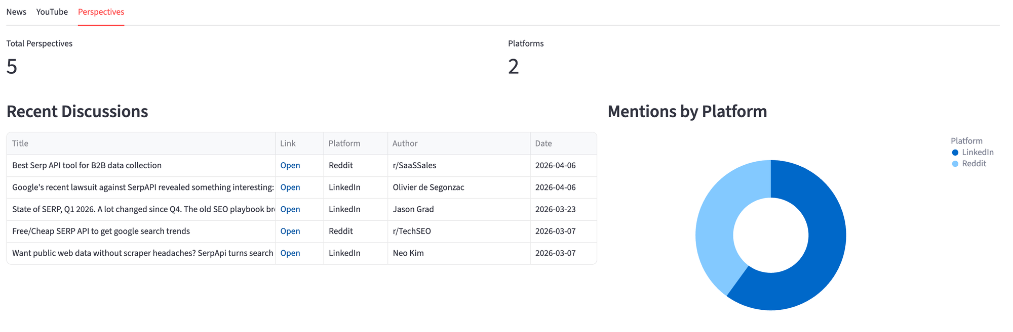 What started as a way to check where "serpapi" shows up on the web became a tool that surfaces patterns you miss manually. The Perspectives tab pulls in LinkedIn posts, Reddit threads, and Quora answers that don't appear in regular news or video searches, and combining them in one view gives you the full picture.