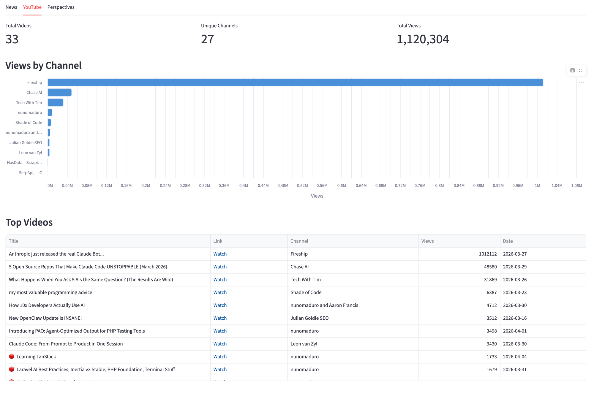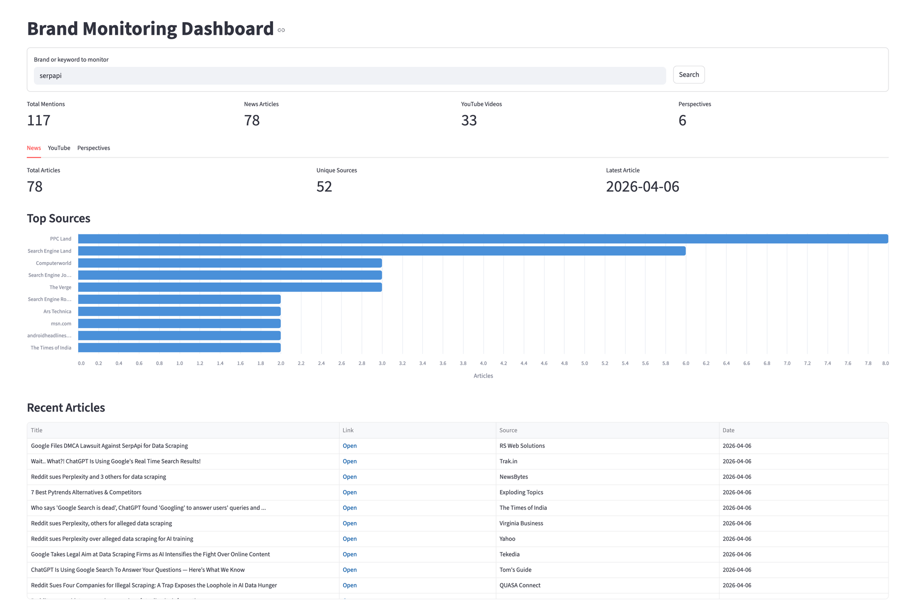 Knowing what people say about your product usually means checking Google News, scrolling through YouTube, and digging into different social media threads. That's three tabs, three interfaces, and no way to compare what you find. This tutorial builds a single dashboard that pulls brand mentions from all three sources using Python and SerpApi.